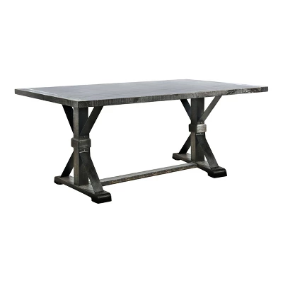 The double pedestals of this six piece dining set feature striking trestle style bases with diagonal riveted metal supports for an Industrial design style. The rectangular table offers a spacious tabletop for entertaining with its four comfortable side chairs and dining bench. Offering a Rustic vibe, this inviting set features an antique black finish with light distressing that lends a vintage feel to the dining set. Chairs boast rolled backs and all seating features linen-look fabric upholstery and button tufting.