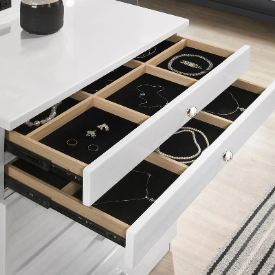This chest will bring a sense of distinction to your home with its unique features. Crafted from strong MDF and veneers in a gorgeous finish, the dazzling chest vanity features gleaming chrome metal drawer pulls, silver trim, and an eye-catching glossy veneer along the drawer faces for an opulent look and feel. The chest features 2 jewelry drawers and 3-drawers. with the top drawers felt-lined inside for jewelry and other valuables and the lower drawers spacious enough for makeup, styling accessories, and more. Wide base add further style as well as stability. This chest has all the glam luxury needed to bestow your bedroom oasis with a sophisticated ambiance.